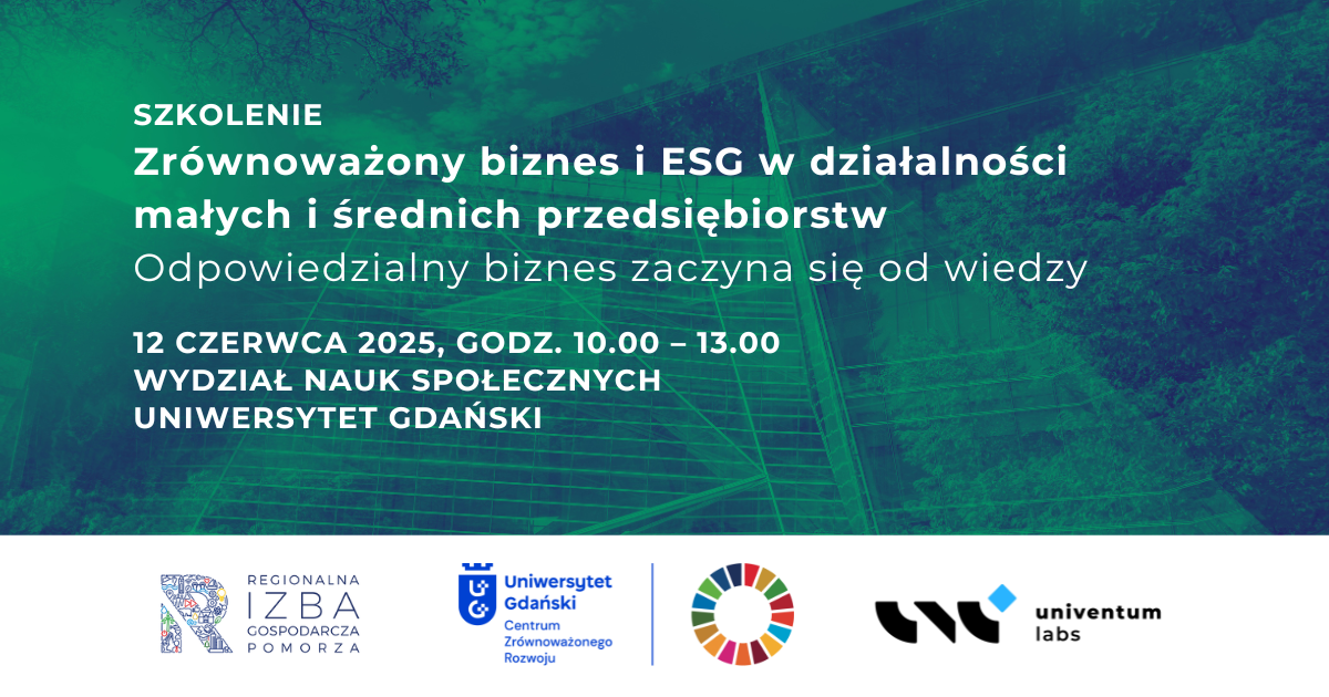 Centrum Zrównoważonego Rozwoju Uniwersytetu Gdańskiego, Regionalna Izba Gospodarcza Pomorza wraz z Univentum Labs, spółką celową Uniwersytetu Gdańskiego mają zaszczyt zaprosić przedstawicieli mikro, małych i średnich przedsiębiorstw na szkolenie: