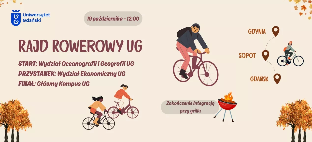 Chcesz aktywnie spędzić czas, poznać nowe osoby i zobaczyć trzy kampusy Uniwersytetu Gdańskiego z rowerowej perspektywy? Dołącz do Rajdu Rowerowego UG! Zapraszamy wszystkich członków społeczności akademickiej na przejazd z Gdyni (park naprzeciwko Wydziału Oceanografii i Geografii) do Gdańska (kampus Oliwa), z przerwą na kampusie w Sopocie. Rajd odbędzie się w niedzielę 19 października 2025 r.  Wydarzenie zakończy się integracyjnym grillem!
