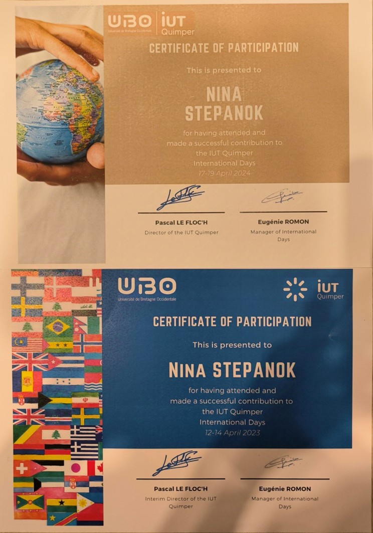 dr Nina Stepanok z Katedry Bankowości i Finansów w 2023 i 2024 r miała okazję uczestniczyć w programie Erasmus+ na IUT Quimper’s International Days w UNIVERSITE DE BRETAGNE OCCIDENTALE we Francji, co dało możliwość zdobycia nowych doświadczeń dydaktycznych i dzielenia się wiedzą na poziomie międzynarodowym, pozwalając zarówno doskonalić własną metodologię nauczania studentów, jak i dzielić się umiejętnościami z nauczycielami akademickimi z innych krajów. W celu osiągnięcia dobrej jakości edukacji i nauczania zawsze jest w procesie rozwoju dydaktycznego, interesuje się nowymi i przyjaznymi dla studentów metodami nauczania, biorze udział w licznych konferencjach i seminariach naukowych. Na przykład w październiku 2024 r. uczestniczyła w webinarium pt. „Nowoczesne metody nauczania i wykorzystanie e-zasobów w dydaktyce akademickiej” zorganizowanym przez Elsevier