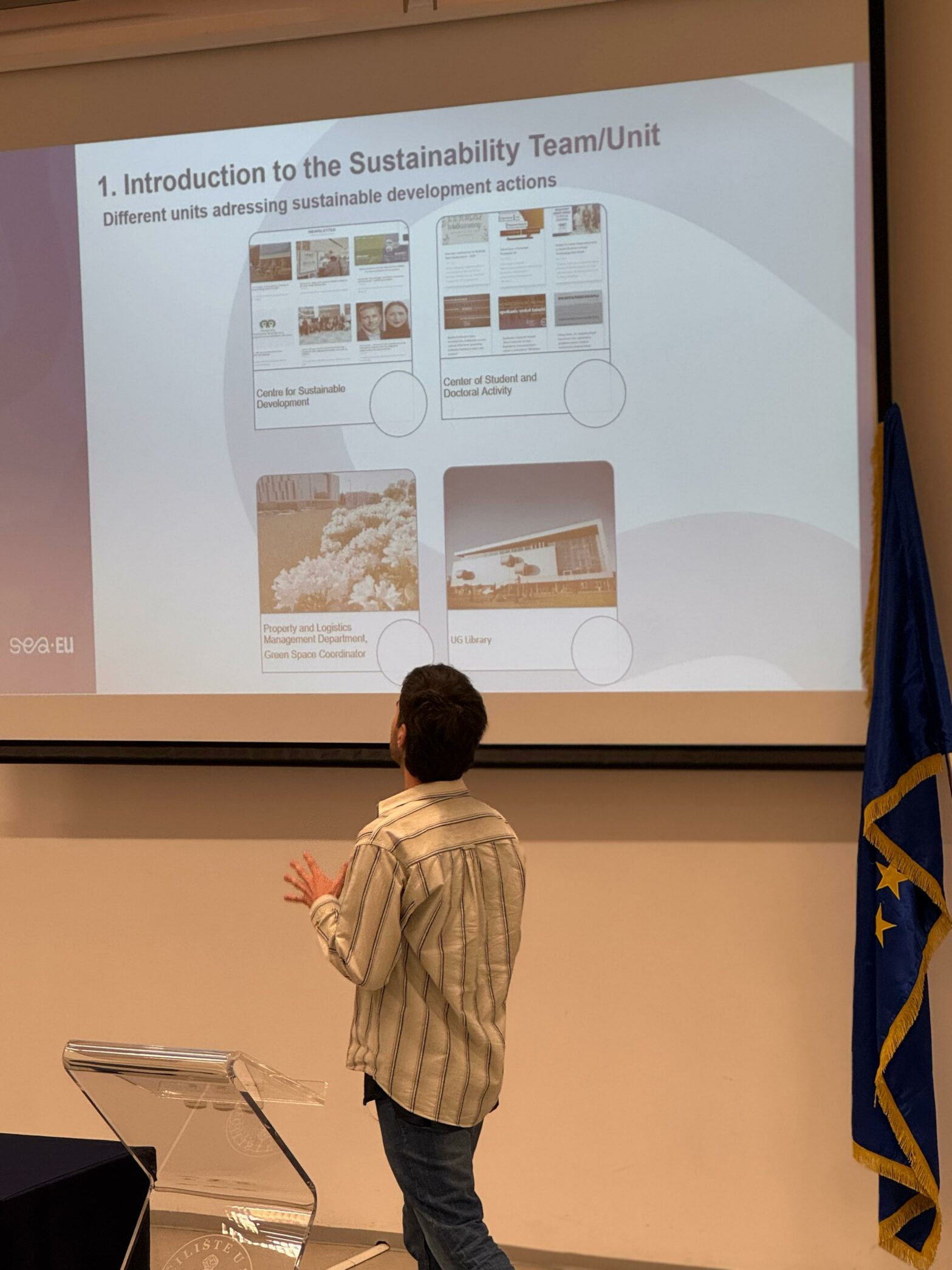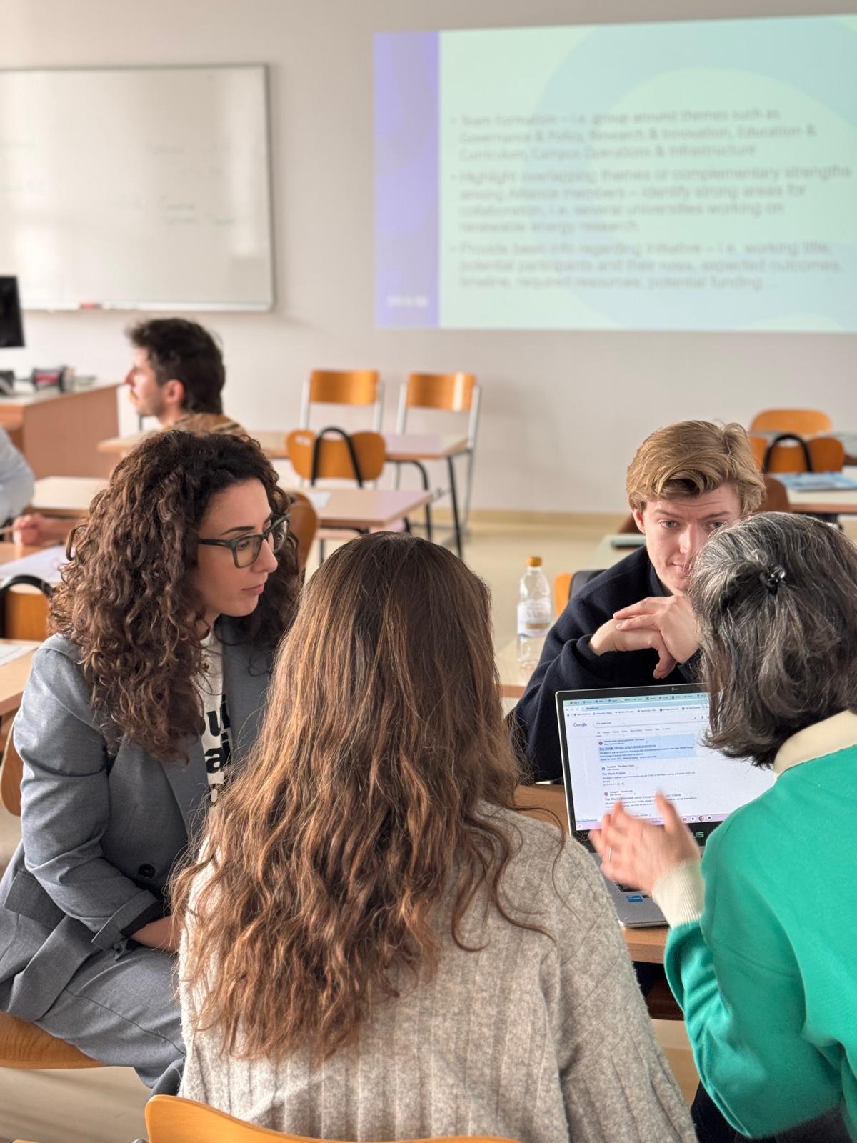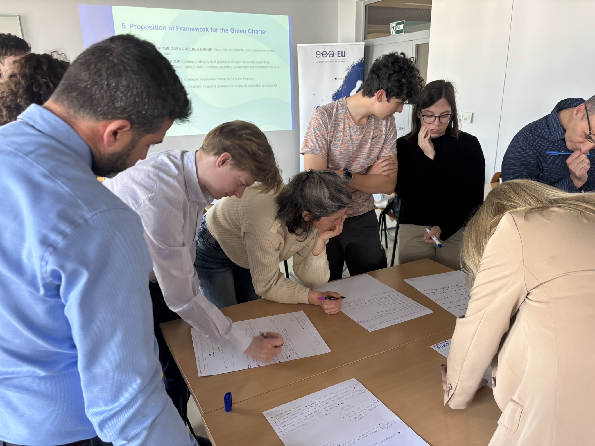 Drugiego dnia francuska delegacja z Uniwersytetu Zachodniej Bretanii zorganizowała warsztaty, mające na celu opracowanie treści „Zielonej Karty” (ang. Green Charter) – kluczowego dokumentu ramowego dla ekologicznej transformacji uczelni w sieci SEA-EU. Po porannym podsumowaniu rezultatów pierwszego dnia uczestnicy, podzieleni na zespoły tematyczne, zidentyfikowali najważniejsze wyzwania i wypracowali propozycje programowe, które następnie poddano głosowaniu celem wyłonienia priorytetowych zapisów. Nowa nazwa karty została zaproponowana przez Marinę Garcia Velazquez, studentkę z Kadyksu: „Charter for a Sustainable Future” (Karta na rzecz zrównoważonej przyszłości). W drugiej części dnia ustalono harmonogram prac nad Kartą przed zbliżającym się SEA-EU Governing Week.