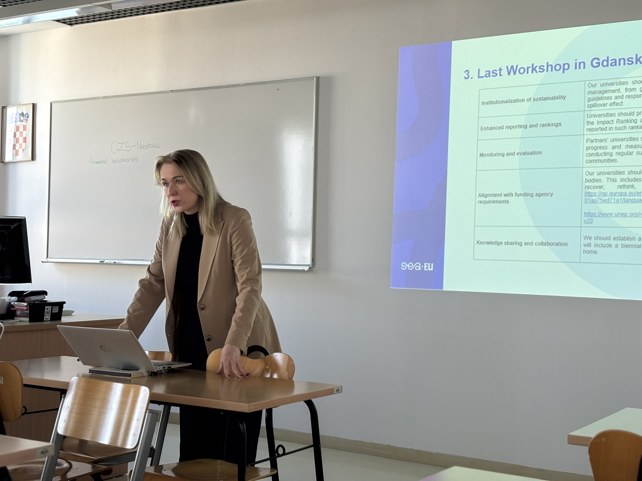 Ostatni dzień warsztatów, koordynowany przez przedstawicieli Uniwersytetu w Splicie koncentrował się na prezentacji flagowych projektów z zakresu SDG realizowanych na kampusach uniwersytetów SEA-EU. Szymon Gronowski zaprezentował Konkurs Zielony Uniwersytet Gdański – specjalną edycję akademickiego budżetu obywatelskiego. Inicjatywa finansowana jest ze środków SEA-EU, a jej zadaniem jest integracja społeczności Uniwersytetu Gdańskiego wokół zielonej transformacji. W drugiej dnia części odbyły się warsztaty tematyczne nad koncepcjami wspólnych przedsięwzięć międzynarodowych. Podczas sesji zamykającej podsumowano ustalenia i określono wzajemne zobowiązania na przyszłość.